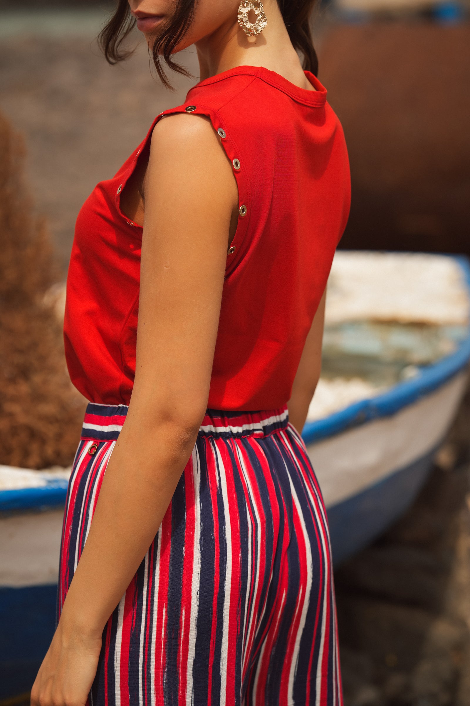 - Detail of metal eyelets along the armholes