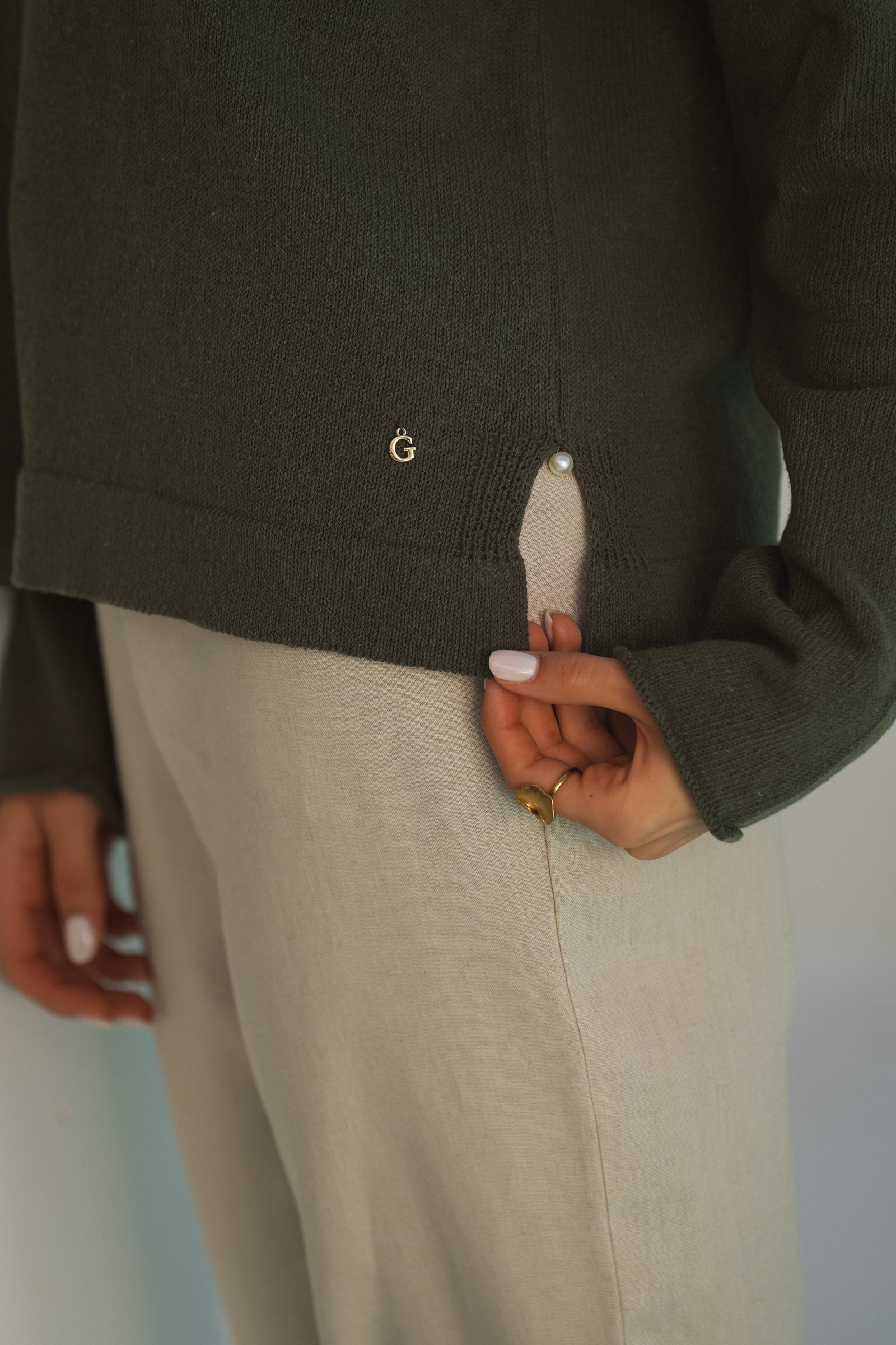 - Abertura lateral com detalhe de botão tipo pérola que acrescenta subtileza ao design