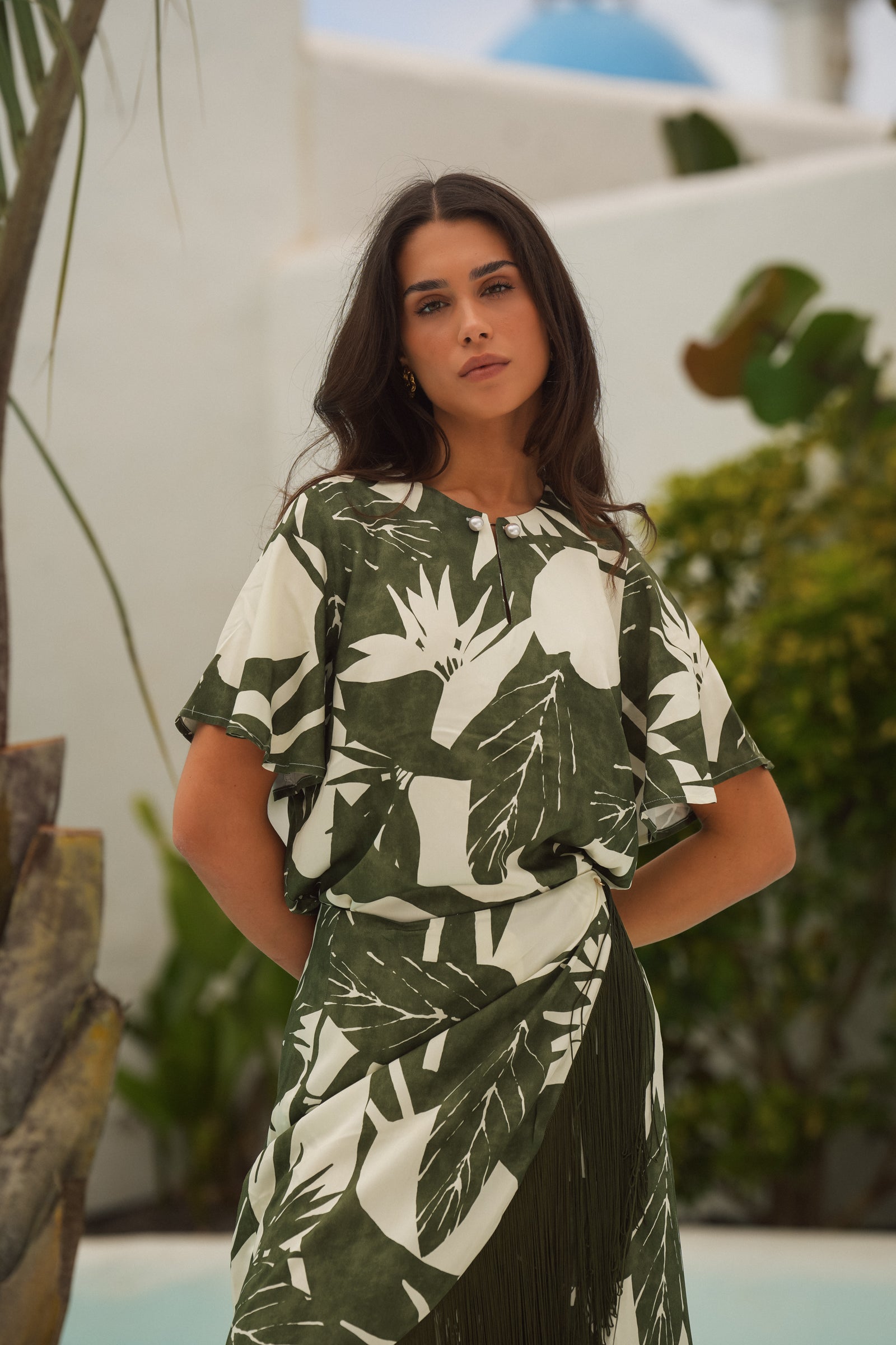 • Blusa fluida com estampado tropical